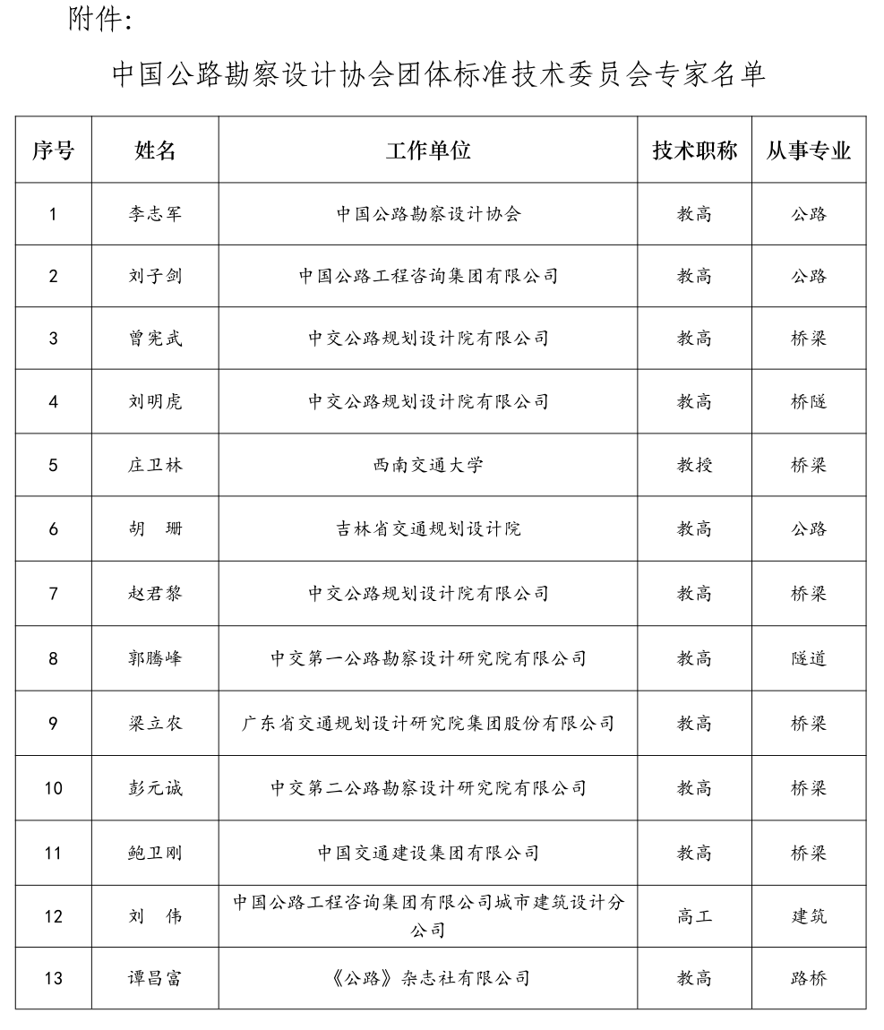 為加快公路勘察設計科技創(chuàng)新成果的推廣運用,推動勘察設計領域的技術(shù)創(chuàng)新,提高公路勘察設計的規(guī)范化程度和質(zhì)量,為交通運輸?shù)目沙掷m(xù)發(fā)展提供重要技術(shù)支撐。經(jīng)協(xié)會理事長辦公會研究決定成立中國公路勘察設計協(xié)會團體標準技術(shù)委員會,現(xiàn)將協(xié)會團體標準技術(shù)委員會專家名單(見附件)予以公布。