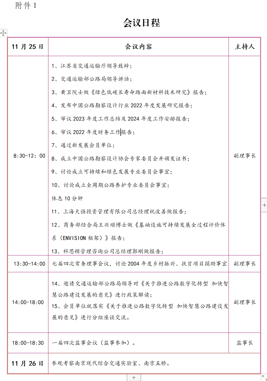 為加強公路勘察設計企業之間的交流溝通,中國公路勘察設計協會定于2023年11月24~26日在江蘇南京召開第七屆理事會第三次理事會議、第七屆理事會第四次常務理事會議、第一屆監事會第四次會議(監事參加)?,F就有關事項通知如下: