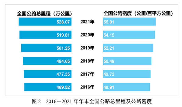 年末全國(guó)公路總里程528.07萬公里,比上年末增加8.26萬公里。公路密度55.01公里/百平方公里,增加0.86公里/百平方公里。公路養(yǎng)護(hù)里程525.16萬公里,占公路總里程比重為99.4%。