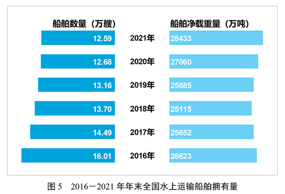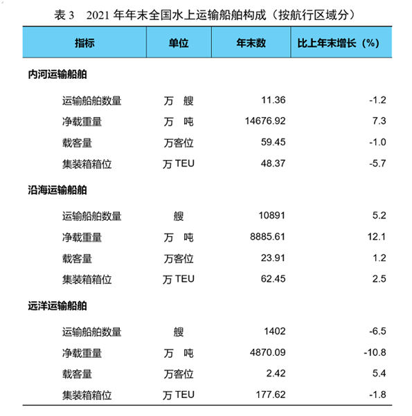 年末全國(guó)擁有水上運(yùn)輸船舶12.59萬艘,比上年末下降0.7%,其中凈載重量28432.63萬噸、增長(zhǎng)5.1%,載客量85.78萬客位、下降0.3%,集裝箱箱位288.43萬標(biāo)準(zhǔn)箱、下降1.6%。