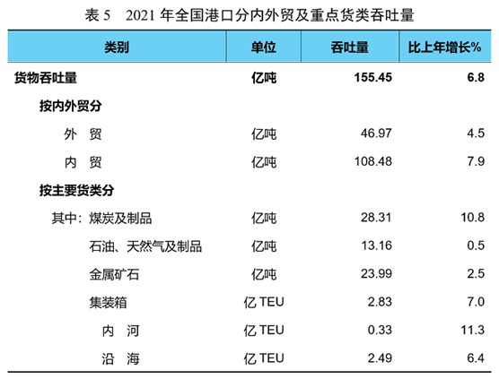 全年全國(guó)港口完成貨物吞吐量155.45億噸,比上年增長(zhǎng)6.8%。其中,內(nèi)河港口完成55.73億噸、增長(zhǎng)9.9%,沿海港口完成99.73億噸、增長(zhǎng)5.2%。完成集裝箱鐵水聯(lián)運(yùn)量754萬TEU,增長(zhǎng)9.8%。