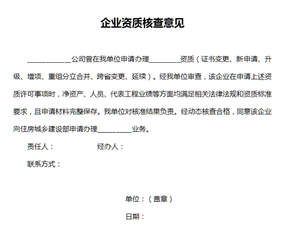 企業(yè)申請資質(zhì)升級(含新申請),增項,延續(xù)以及發(fā)生重組分立、合并、跨省變更、國企改制(含事業(yè)單位改制)資質(zhì)重新核定的,由我部辦理。申請上述事項前,需由原發(fā)放證書的省級住房城鄉(xiāng)建設(shè)主管部門按要求出具企業(yè)資質(zhì)核查意見(具體格式附后)。