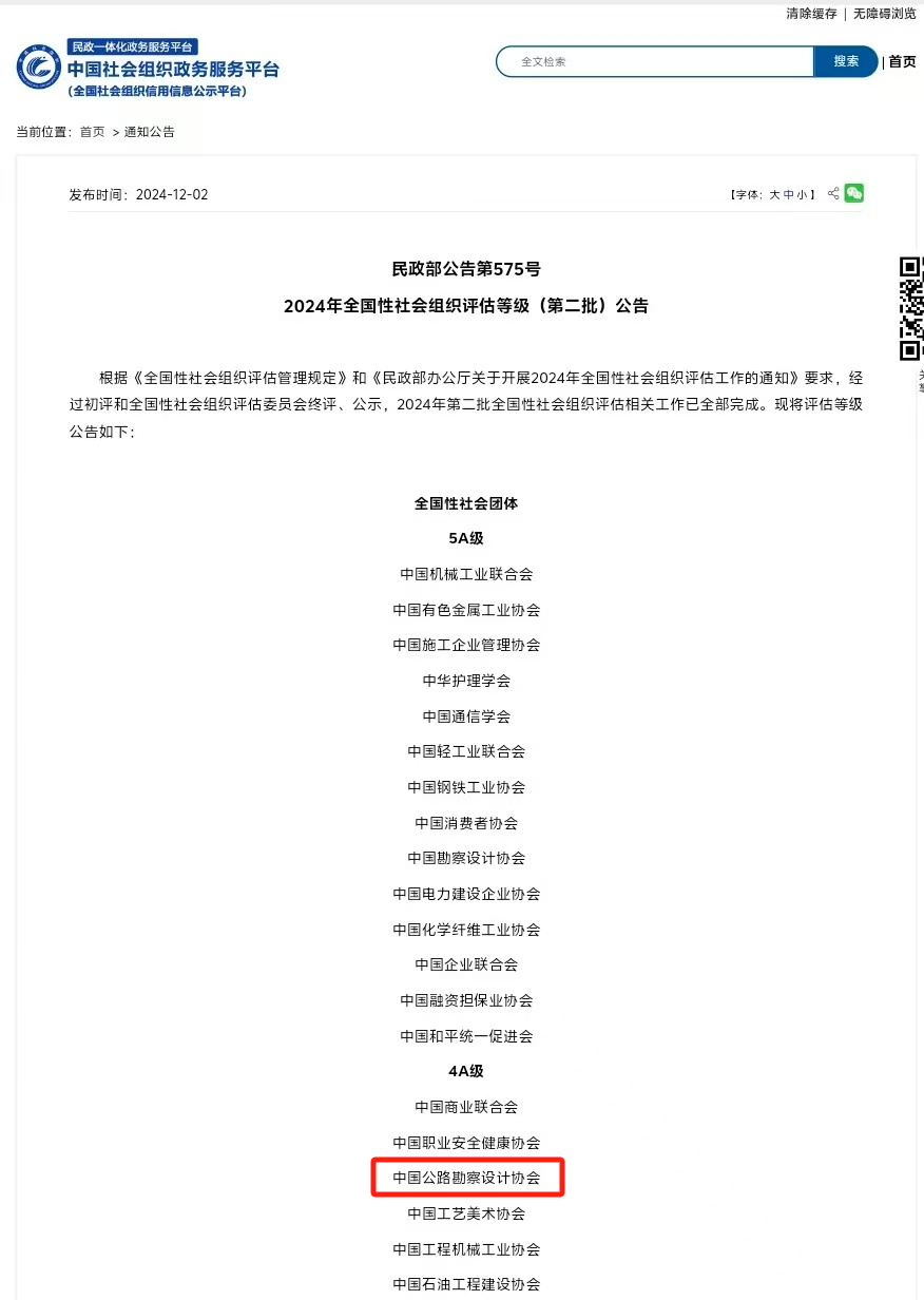 12月2日,民政部發布了《2024年全國性社會組織評估等級(第二批)公告》(民政部公告第575號),中國公路勘察設計協會榮獲4A級全國性社會組織的殊榮。這一榮譽的取得,離不開中央社會工作部、民政部以及交通運輸部等相關政府部門的深切關懷與悉心指導,離不開協會全體干部職工、各分支機構及所有會員單位的團結協作,是對近年來協會各項工作的充分肯定。